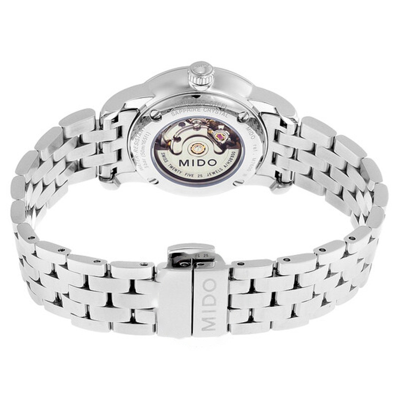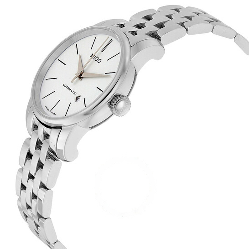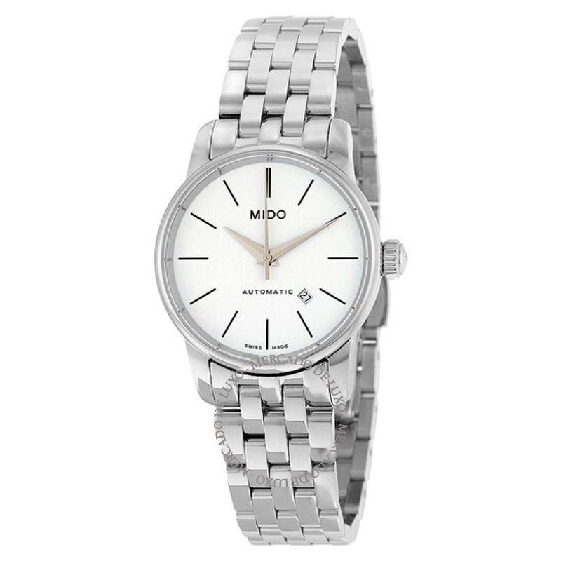 O Mido Baroncelli Automático Mostrador Branco Aço Inoxidável 29 mm equilibra superfícies polidas e escovadas para um jogo de luz refinado. caixa em aço inoxidável, mostrador prateado, 29 mm. Texturas bem resolvidas falam de precisão e cuidado à mão.