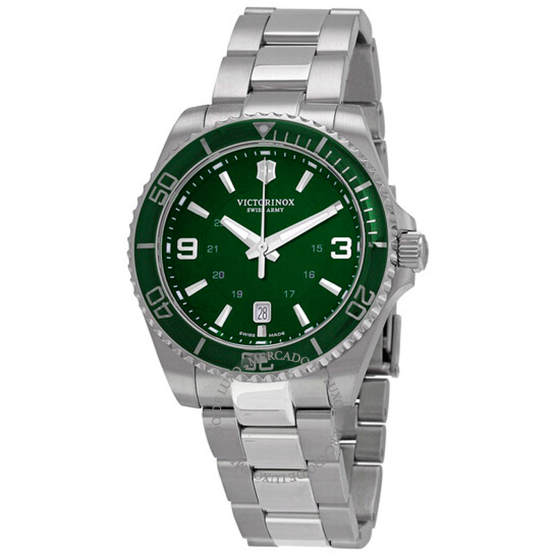 O Victorinox Mostrador verde de quartzo Maverick 43 mm Um estudo de proporções que privilegia conforto no pulso e presença. Caixa em aço inoxidável, Mostrador prateado, 43 mm.