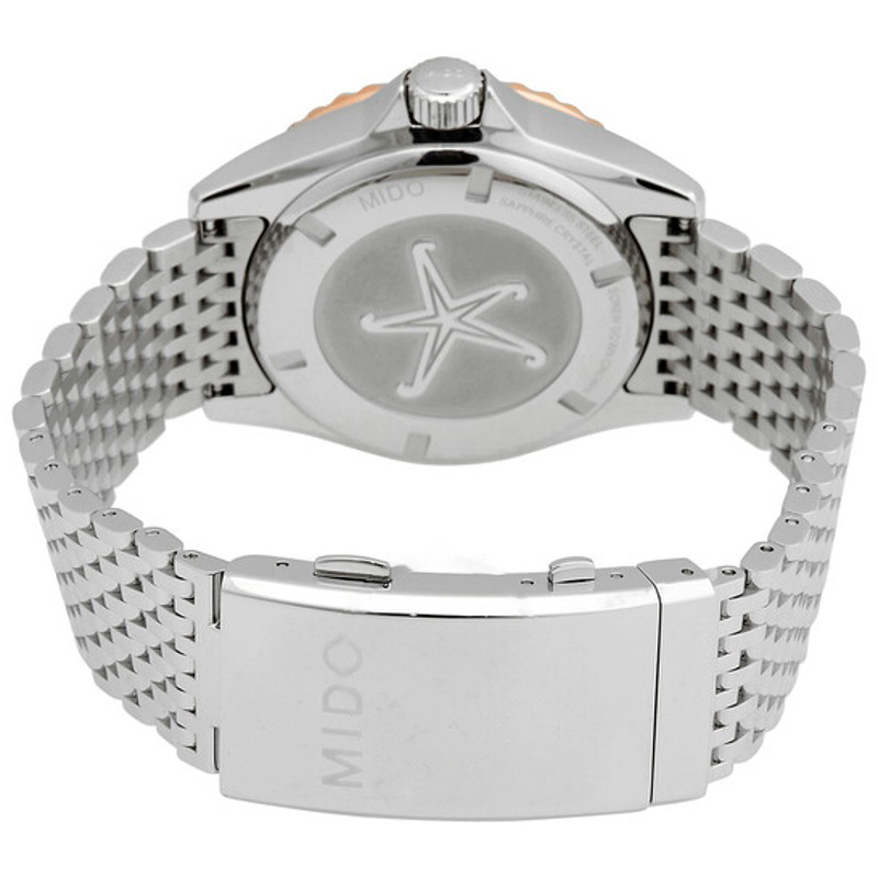O Mido Ocean Star Tribute Automático Mostrador Preto 40 mm Interpreta os códigos da casa com serenidade e atenção à luz. Caixa em aço inoxidável, rosa, Mostrador preto, 40 mm.