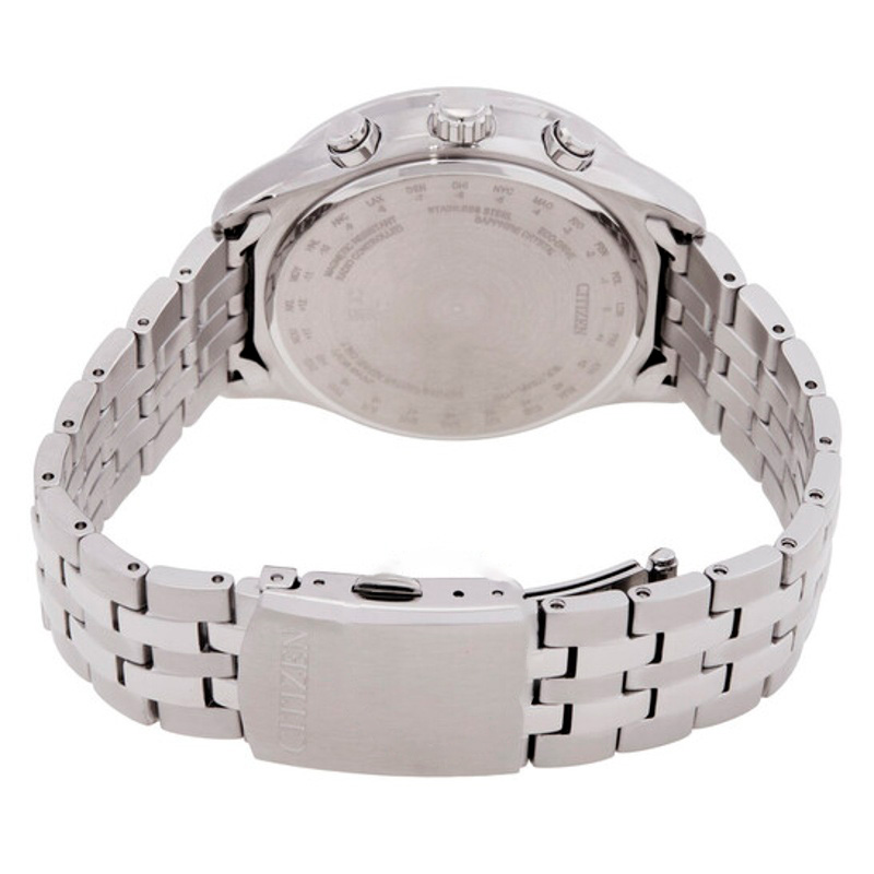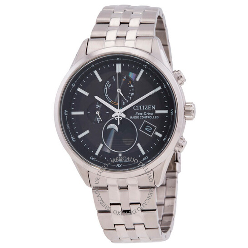 O Citizen Eco-Drive com mostrador preto e fases da lua controlado por rádio 42 mm Sintetiza elegância, conforto e um toque de vanguarda. Caixa em aço inoxidável, Mostrador preto, 42 mm.