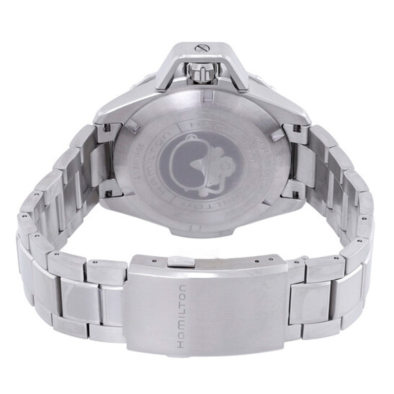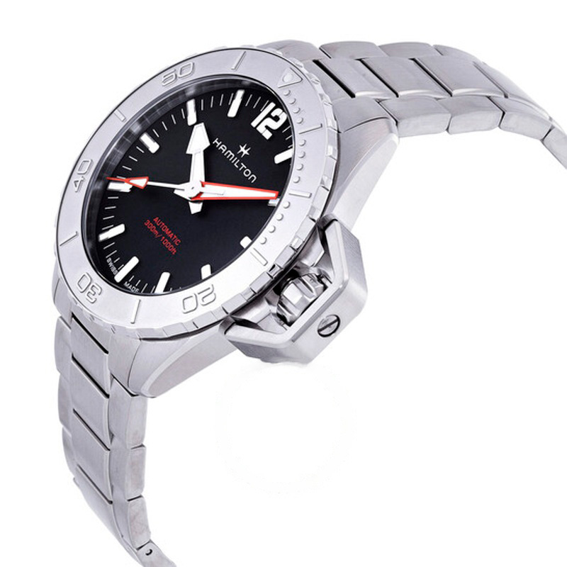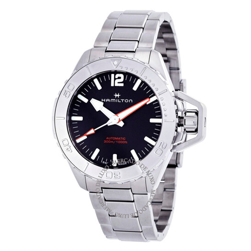 O Hamilton Watch Khaki Navy Frogman Automático Mostrador Preto 46 mm Interpreta os códigos da casa com serenidade e atenção à luz. Caixa em aço inoxidável, Mostrador preto, 46 mm.A manufatura calibra...
