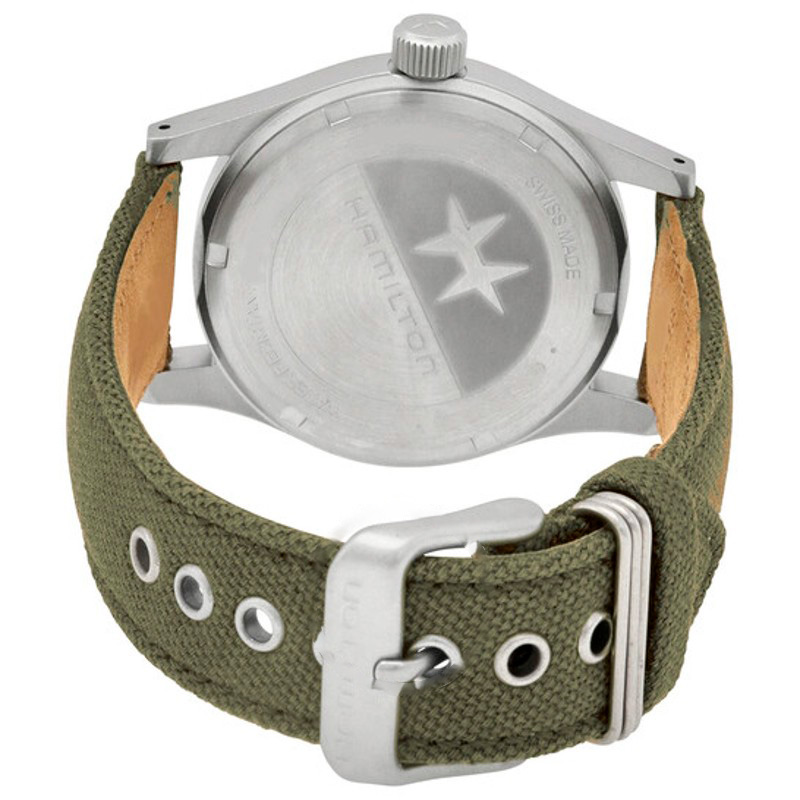 O Hamilton Watch Campo cáqui mecânico mostrador verde 38 mm Traz uma leitura arquitetônica do tempo com superfícies bem trabalhadas. Caixa em aço inoxidável, Mostrador prateado, 38 mm.