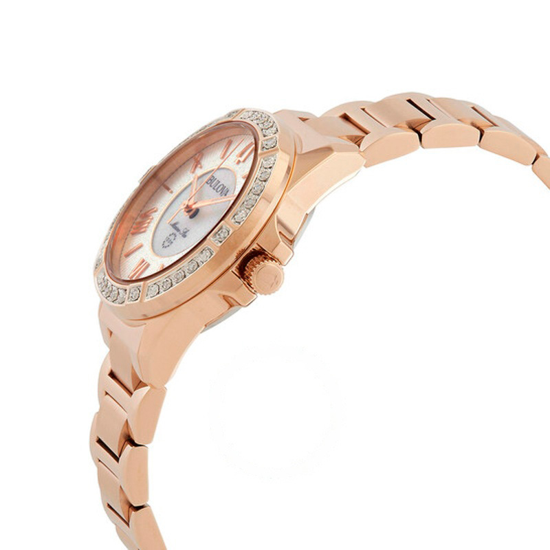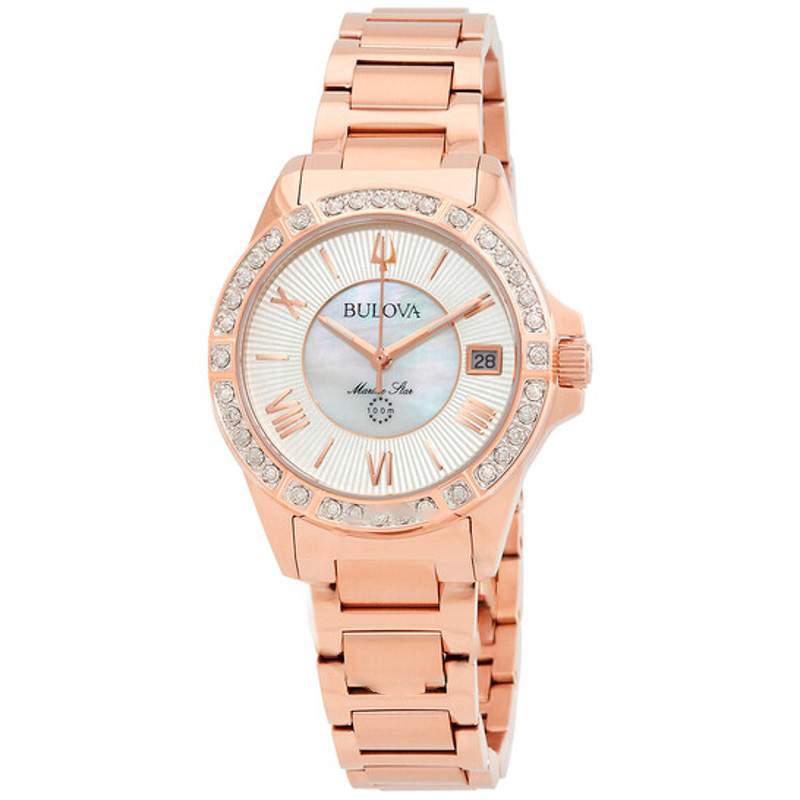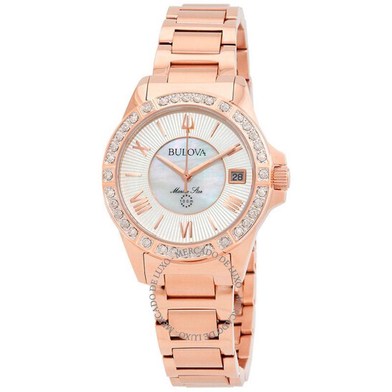 O Bulova Mostrador de quartzo com e madrepérola branca Marine Star combina arquitetura de caixa precisa com detalhes de alta lapidação. mostrador madrepérola com . Resultado visual com luzes e...