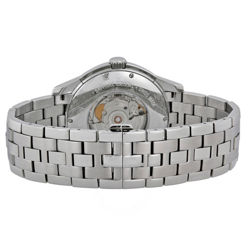 A manufatura calibra o movimento pensando em precisão, eficiência e manutenção tranquila. Movimento automático, frequência 28800 vph, complicações: data, vidro safira, WR 100 m, pulseira bracelete metálico.