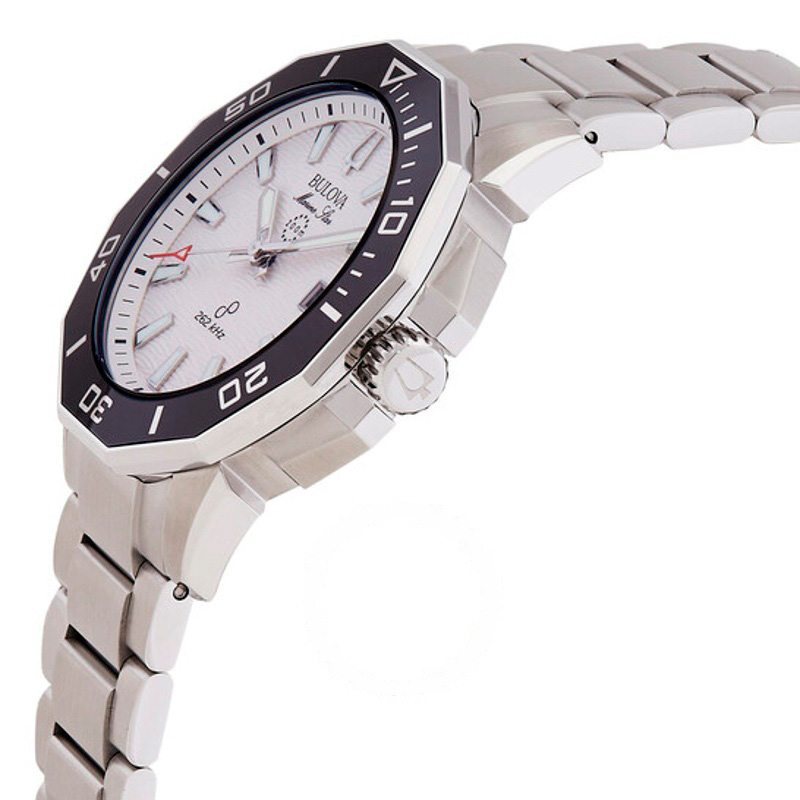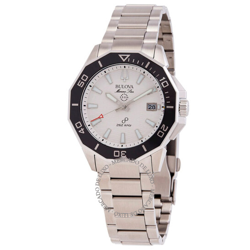 O Bulova Marine Star HPQ Precisionist Quartzo Mostrador Branco 43 mm Sintetiza elegância, conforto e um toque de vanguarda. Caixa em aço inoxidável, cerâmica, Luneta cerâmica, Mostrador preto, 43 mm.