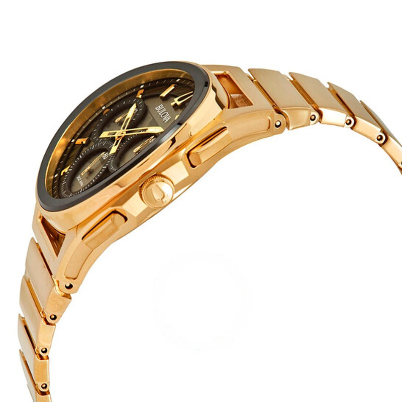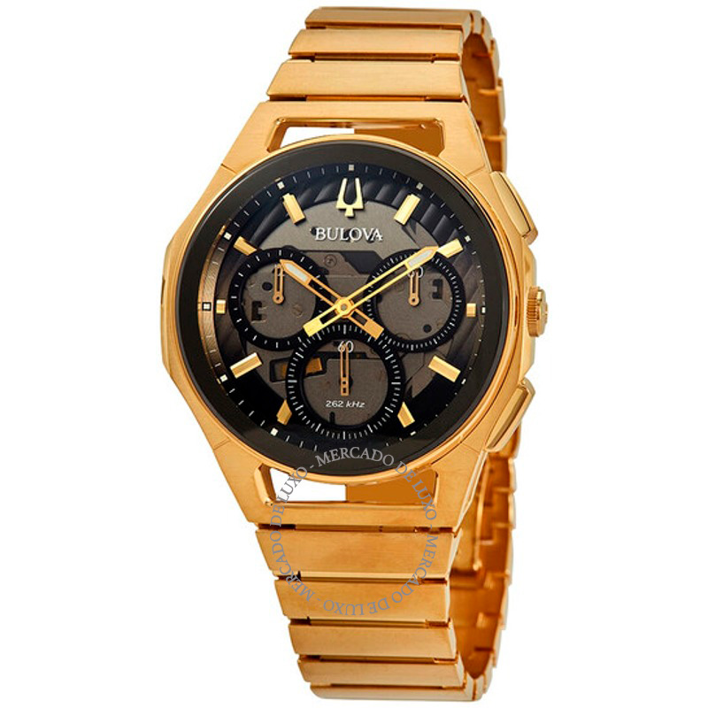 O Bulova Curv Chronograph Quartz 44 mm Equilibra herança e desenho atual em proporções bem resolvidas. Caixa em aço inoxidável, Mostrador champagne, 44 mm.