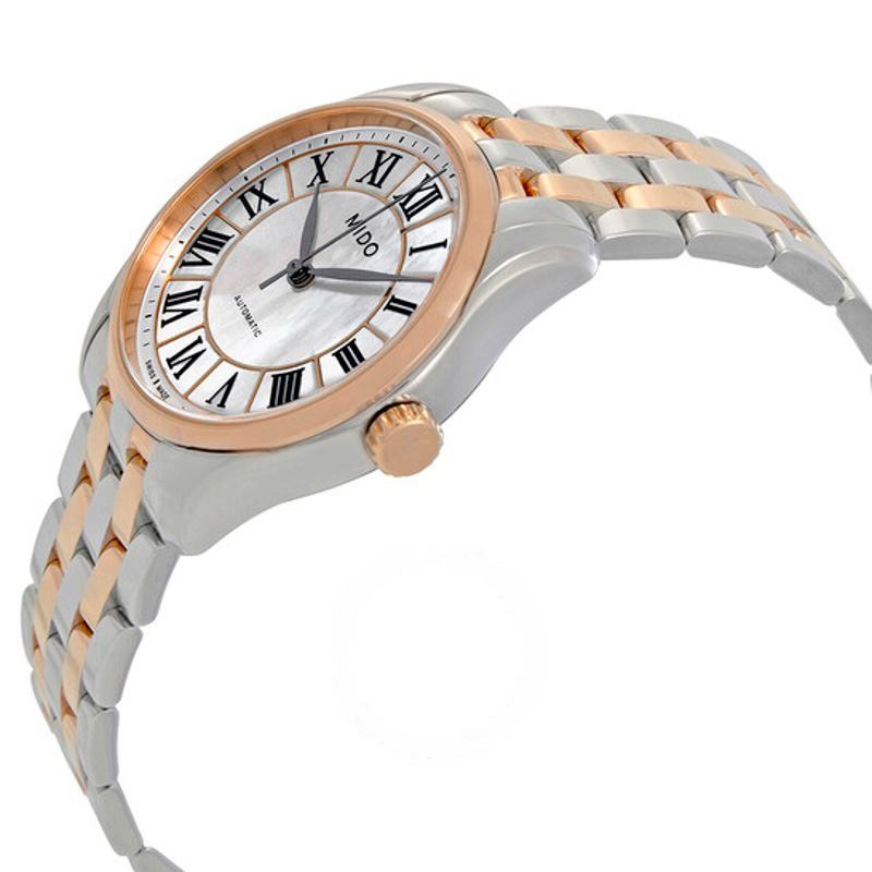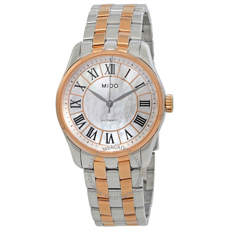 O Mido Belluna II Mostrador Madrepérola 33 mm combina proporções clássicas a detalhes de atelier que fazem a diferença no pulso. caixa em aço inoxidável, rosa, mostrador madrepérola, 33 mm. Texturas bem resolvidas falam de precisão e cuidado à mão.