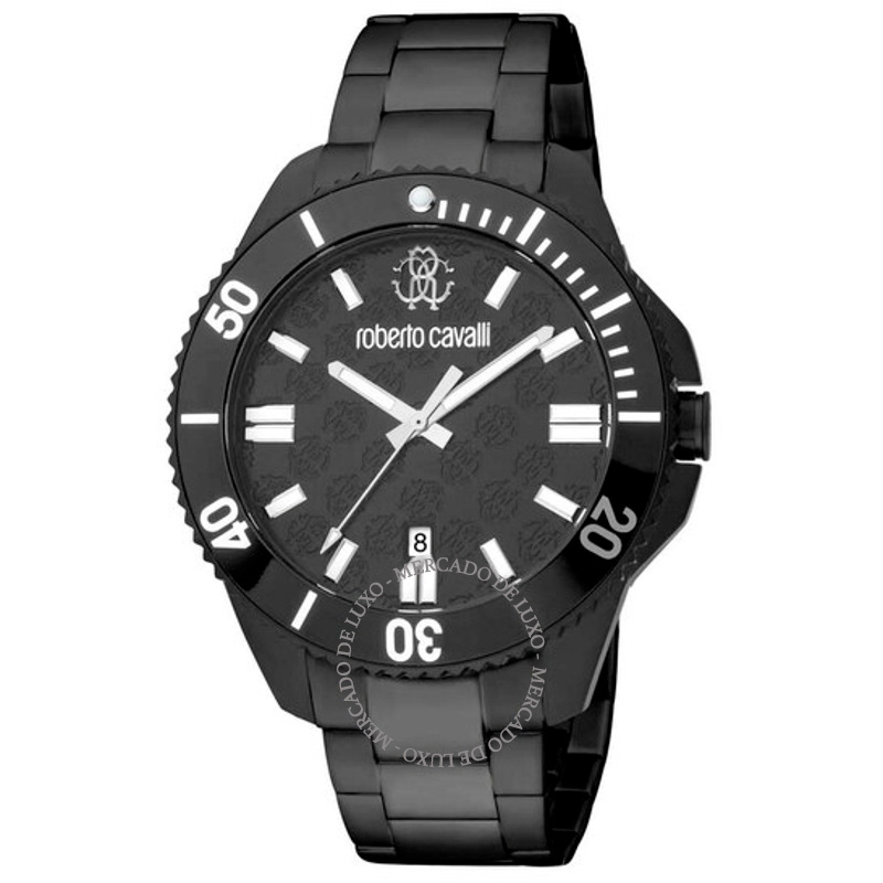 O Roberto Cavalli Mostrador preto de quartzo da moda 44 mm Traz uma leitura arquitetônica do tempo com superfícies bem trabalhadas. Mostrador preto, 44 mm.