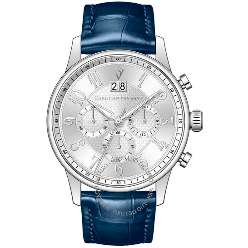 O Christian Van Sant Cronógrafo Heritage Quartzo Mostrador Prateado 42 mm Sintetiza elegância, conforto e um toque de vanguarda. Caixa em aço inoxidável, Mostrador azul, 42 mm.