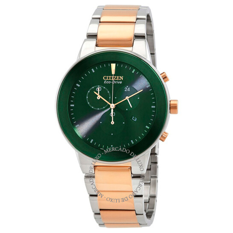 O Citizen Cronógrafo GMT Eco-Drive Mostrador Verde 43 mm Traz uma leitura arquitetônica do tempo com superfícies bem trabalhadas. Caixa em aço inoxidável, rosa, Mostrador prateado, 43 mm.Tecnologia e...