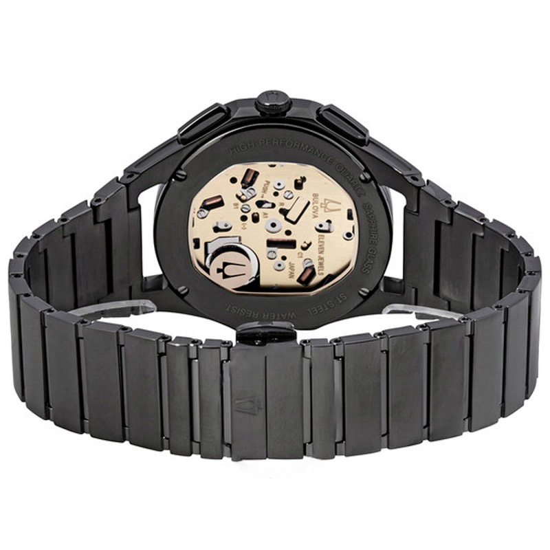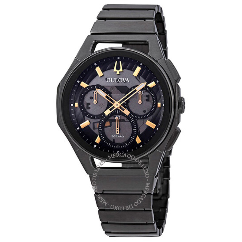 O Bulova Cronógrafo Curvo Mostrador Cinza Escuro 44 mm Traz uma leitura arquitetônica do tempo com superfícies bem trabalhadas. Caixa em aço inoxidável, Mostrador preto, 44 mm.
