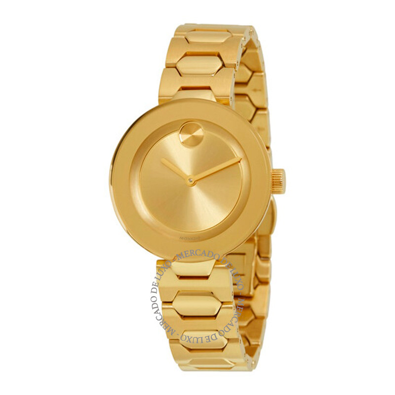 O Movado Mostrador dourado ousado 32 mm eleva códigos da casa com leitura contemporânea e ergonomia exemplar. caixa em aço inoxidável, amarelo, mostrador champagne, 32 mm. Texturas bem resolvidas...