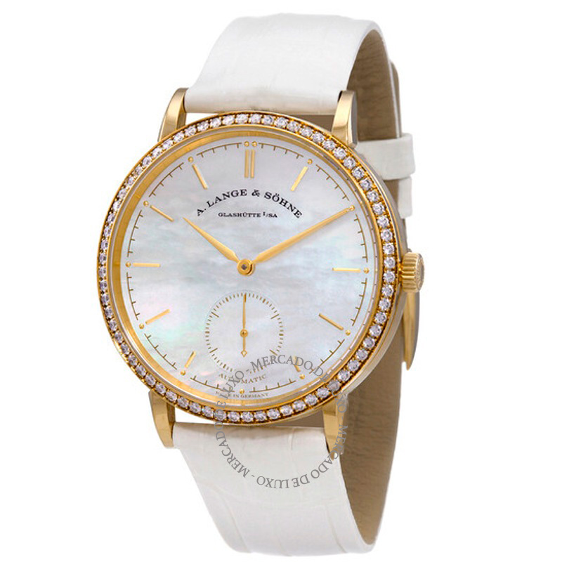 O Saxonia Ouro Amarelo 18K Diamante Automático da A. Lange & Söhne é uma ode à elegância atemporal, combinando a sofisticação clássica com a precisão técnica. Sua caixa em ouro amarelo 18k, adornada com diamantes incrustados na luneta, reflete o brilho sutil da alta relojoaria, enquanto o mostrador em madrepérola exsuda feminilidade delicada. Os marcadores de horas em índices e ponteiros dourados criam um contraste harmonioso, realçando a pureza do design minimalista.
