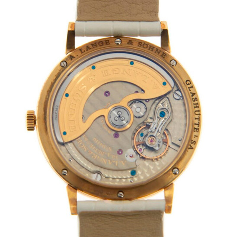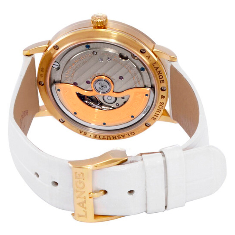 No coração deste relógio, o calibre L086.4 automático, com 31 joias e uma reserva de marcha de 72 horas, demonstra a maestria da manufatura em Glashütte. A placa de três quartos, visível através do fundo transparente, apresenta chatons de ouro polido e gravações manuais, um testemunho do artesanato impecável da marca. A pulseira em couro de jacaré branco completa a estética, envolvendo o pulso com um toque de luxo discreto.