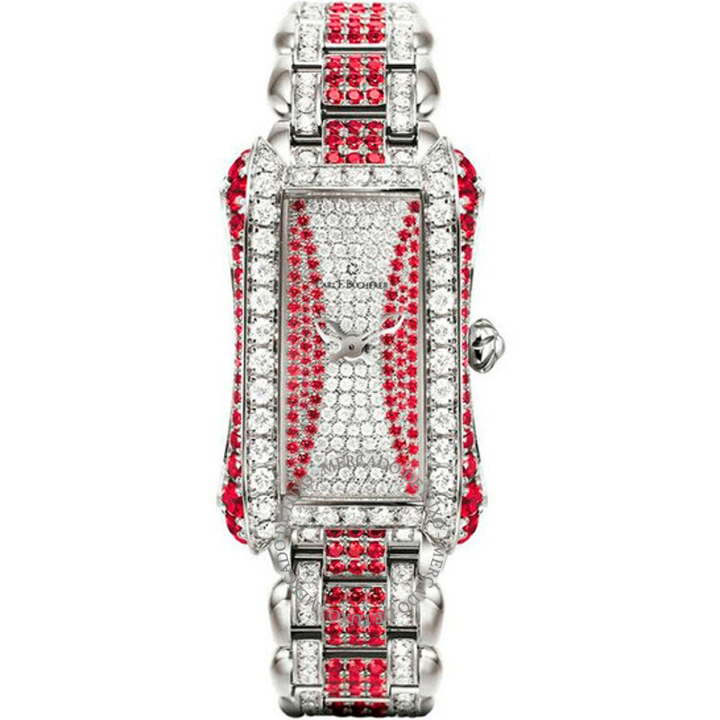 O mostrador pavê de diamantes com rubis brilha com ponteiros prateados, criando opulência. O movimento de quartzo CFB 1850 oferece precisão, protegido por cristal de safira. O formato único adiciona glamour.