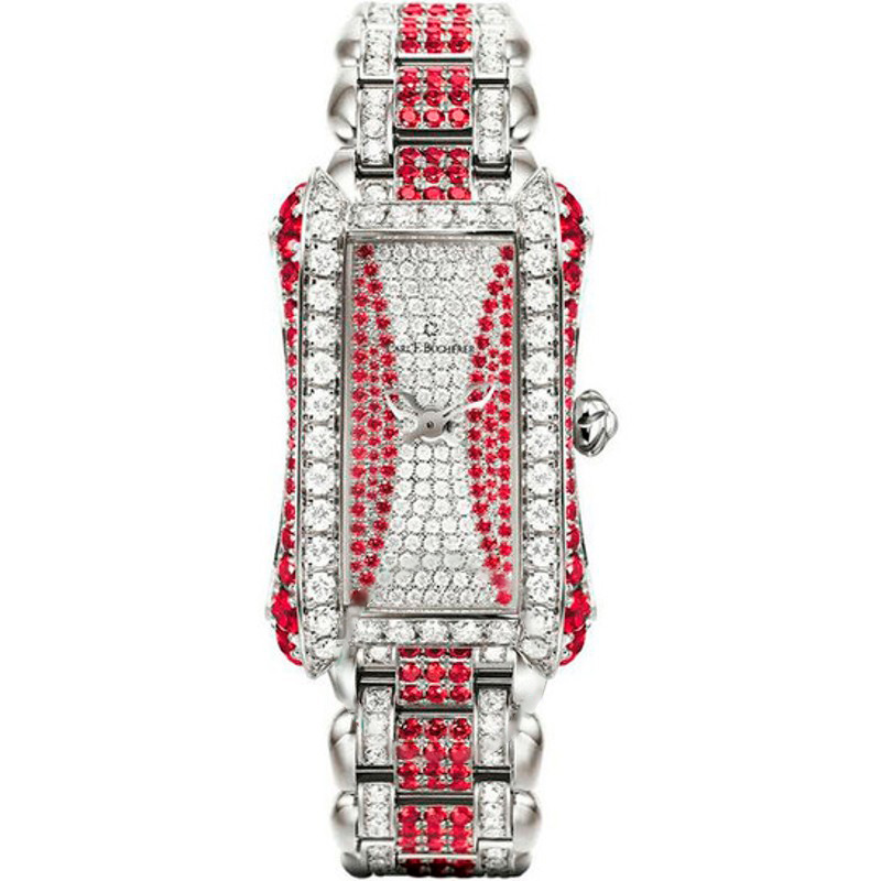 A Carl F. Bucherer revela o Alacria, um relógio de 26 mm x 38 mm em ouro branco 18K com diamantes e rubis. Esta peça com pulseira de ouro branco é uma fusão de luxo, perfeita para a mulher que busca exclusividade.