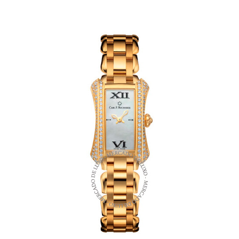 O mostrador de madre-pérola brilha com ponteiros dourados e marcadores de hora índices/romanos, com 140 diamantes (0.75 ct) na caixa. O movimento de quartzo CFB 1850 garante precisão, protegido por cristal de safira. O formato único adiciona encanto.