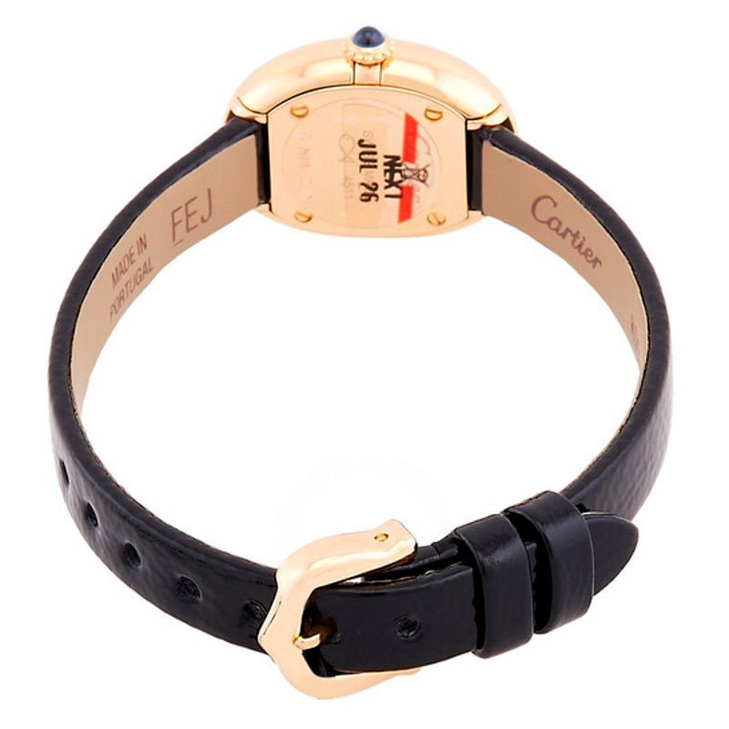 O mostrador prateado guilhochê brilha com ponteiros azuis e marcadores romanos negros, criando um contraste clássico que captura a essência da elegância Cartier. O movimento de quartzo garante precisão silenciosa, enquanto a coroa com cabochão de safira adiciona um toque de cor régia. Protegido por cristal de safira, este relógio é uma joia durável para a vida cotidiana.