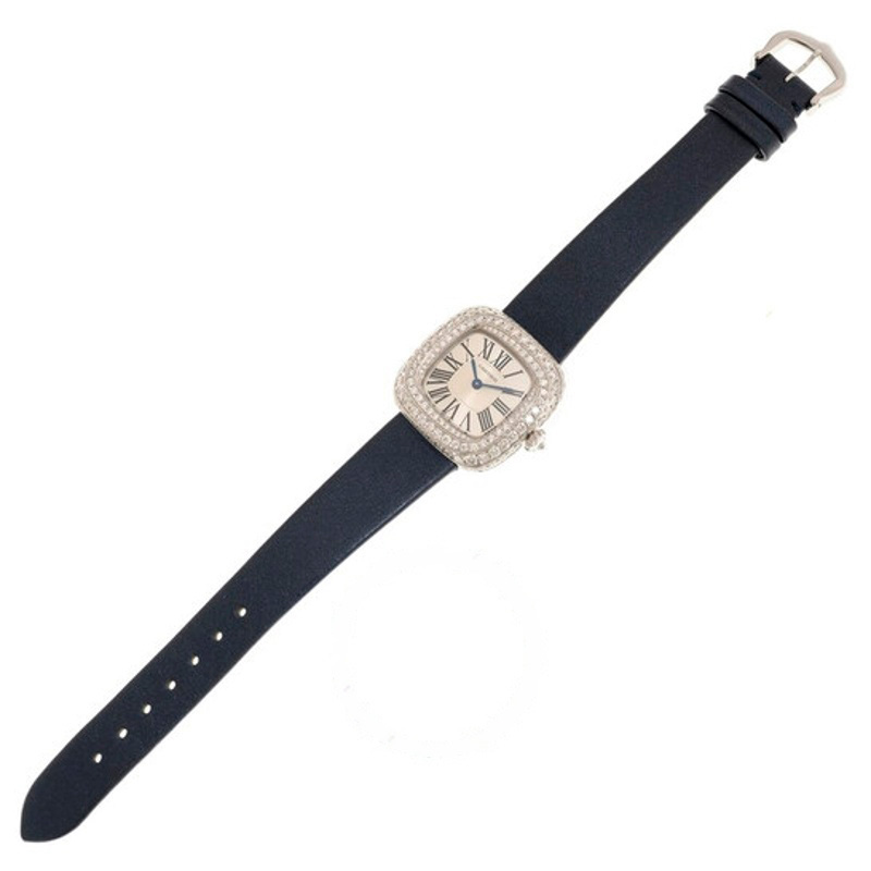 O mostrador prateado reluz com ponteiros azuis e marcadores romanos negros, criando um contraste clássico que destaca os diamantes lapidados brilhantes na moldura. O movimento de quartzo garante precisão impecável, enquanto a coroa de puxar/empurrar adiciona simplicidade. Protegido por cristal de safira resistente a riscos, este relógio é uma joia resistente para a vida glamorosa.