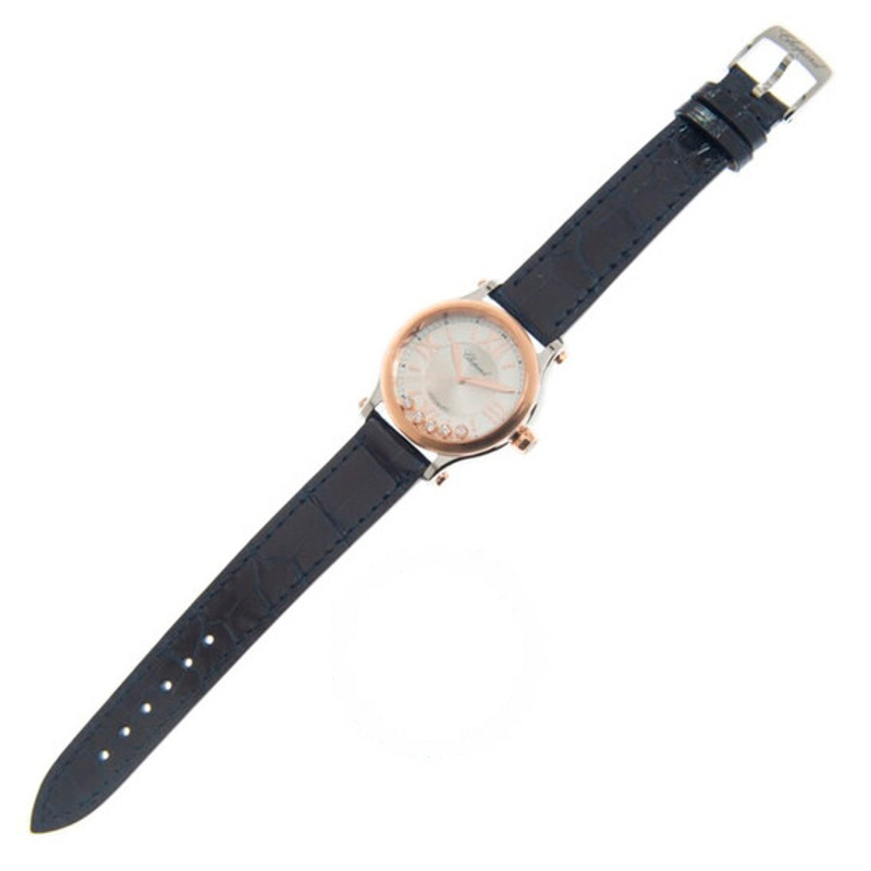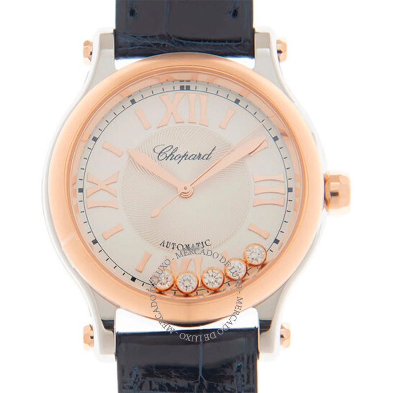 O mostrador prateado, com marcadores de horas em índices e algarismos romanos às 3, 6, 9 e 12 horas, reflete a precisão suíça do calibre 09.01-C, com certificação de cronômetro. Inspirado na coleção Happy Sport, lançada em 1993 por Caroline Scheufele, este relógio combina a estética esportiva com a elegância de joias, ideal para a mulher moderna que transita entre looks casuais e ensembles de alta moda. Os diamantes flutuantes, marca registrada da Chopard, adicionam um toque de magia, capturando a essência de um design que é tanto dinâmico quanto atemporal.