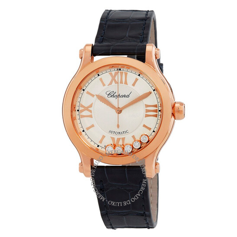 O mostrador prateado, com marcadores de horas em algarismos romanos e ponteiros em ouro rosa, reflete a precisão suíça do calibre 09.01-C, com certificação de cronômetro e reserva de marcha de 42 horas. Inspirado na coleção Happy Sport, lançada em 1993 por Caroline Scheufele, este relógio combina a estética esportiva com a elegância de joias, ideal para a mulher moderna que transita entre looks casuais e ensembles de alta moda. Os diamantes flutuantes, marca registrada da Chopard, adicionam um toque de magia, capturando a essência de um design que é tanto dinâmico quanto atemporal.