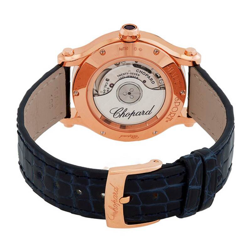 O Happy Sport da Chopard é uma celebração da alegria de viver, combinando a ousadia de um relógio esportivo com a sofisticação de diamantes flutuantes. Este modelo de 33 mm em ouro rosa 18 quilates, com uma pulseira de couro de jacaré azul, apresenta um mostrador prateado adornado com cinco diamantes flutuantes que dançam livremente entre cristais de safira, criando um espetáculo visual único. A caixa polida, com seu aro fixo em ouro rosa, reflete a luz com um brilho etéreo, tornando esta peça perfeita para ocasiões especiais ou para o uso diário com um toque de glamour.