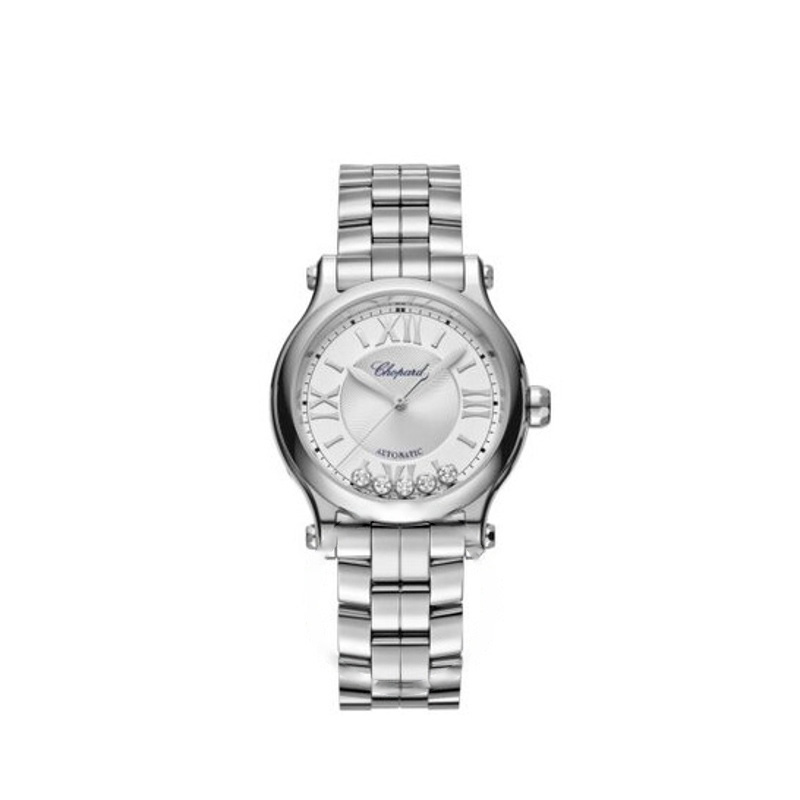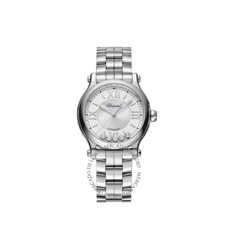 O mostrador prateado, com marcadores de horas em algarismos romanos prateados, reflete a precisão suíça do calibre 09.01-C, com certificação de cronômetro e reserva de marcha de 42 horas. Inspirado na coleção Happy Sport, lançada em 1993 por Caroline Scheufele, este relógio combina a estética esportiva com a elegância de joias, ideal para a mulher moderna que transita entre looks casuais e ensembles de alta moda. Os diamantes flutuantes, marca registrada da Chopard, adicionam um toque de magia, capturando a essência de um design que é tanto dinâmico quanto atemporal.