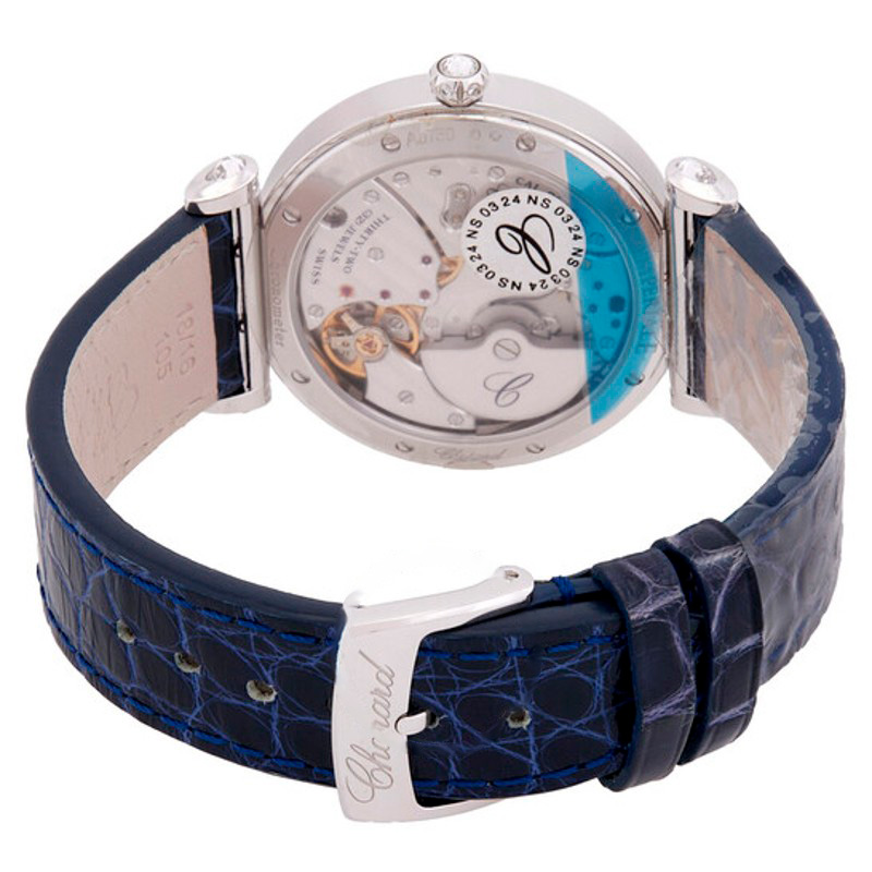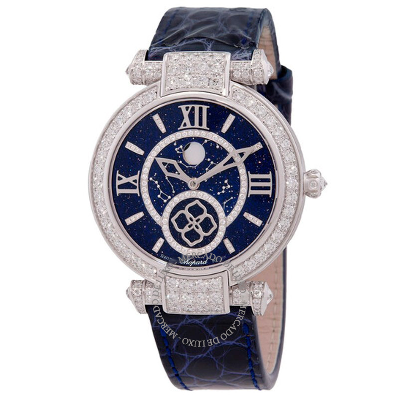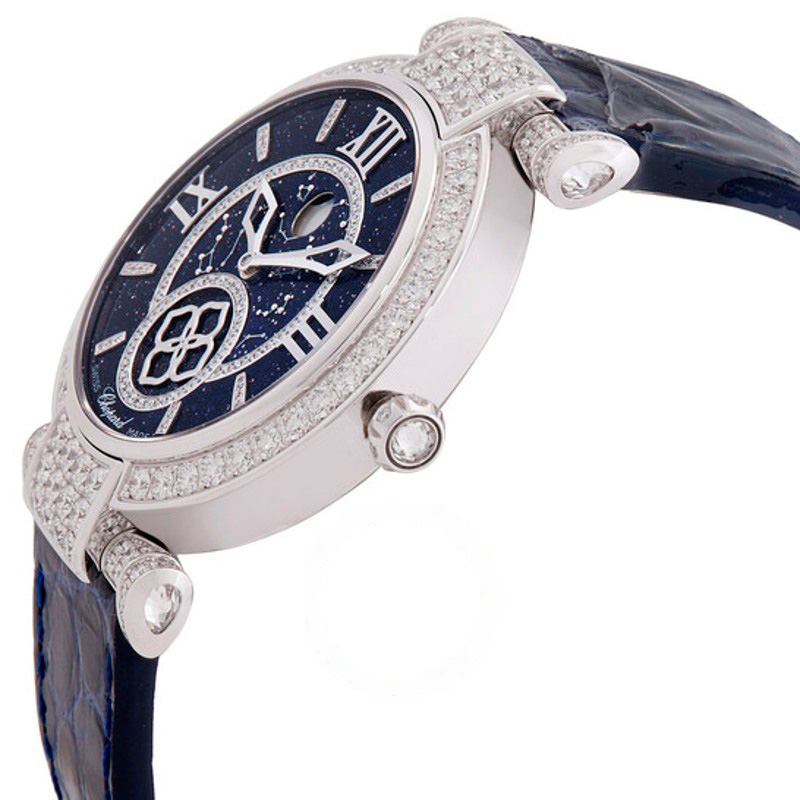 O mostrador em aventurina azul, com marcadores de horas em diamantes e algarismos romanos, reflete a precisão suíça do movimento automático, com uma complicação de fase lunar que adiciona um toque de poesia funcional. Inspirado na coleção Imperiale, este relógio captura a essência da herança da Chopard, fundada em 1860, combinando detalhes luminosos com uma estética que evoca a realeza celestial. É uma peça que celebra a mulher moderna, que transita entre a tradição e a inovação com graça effortless.