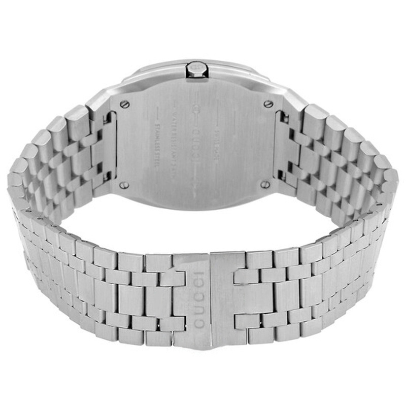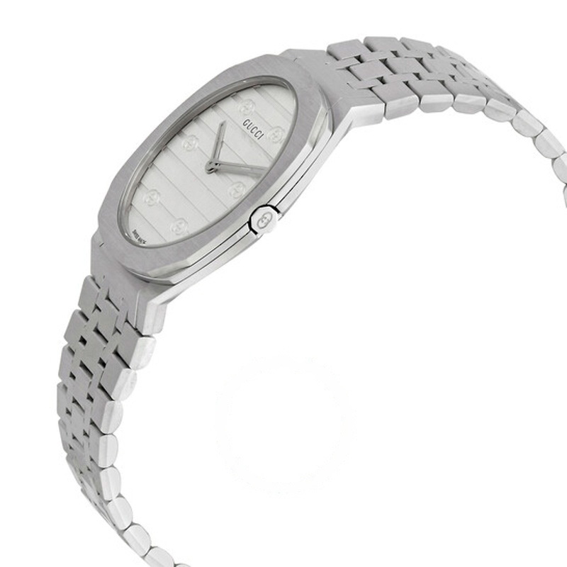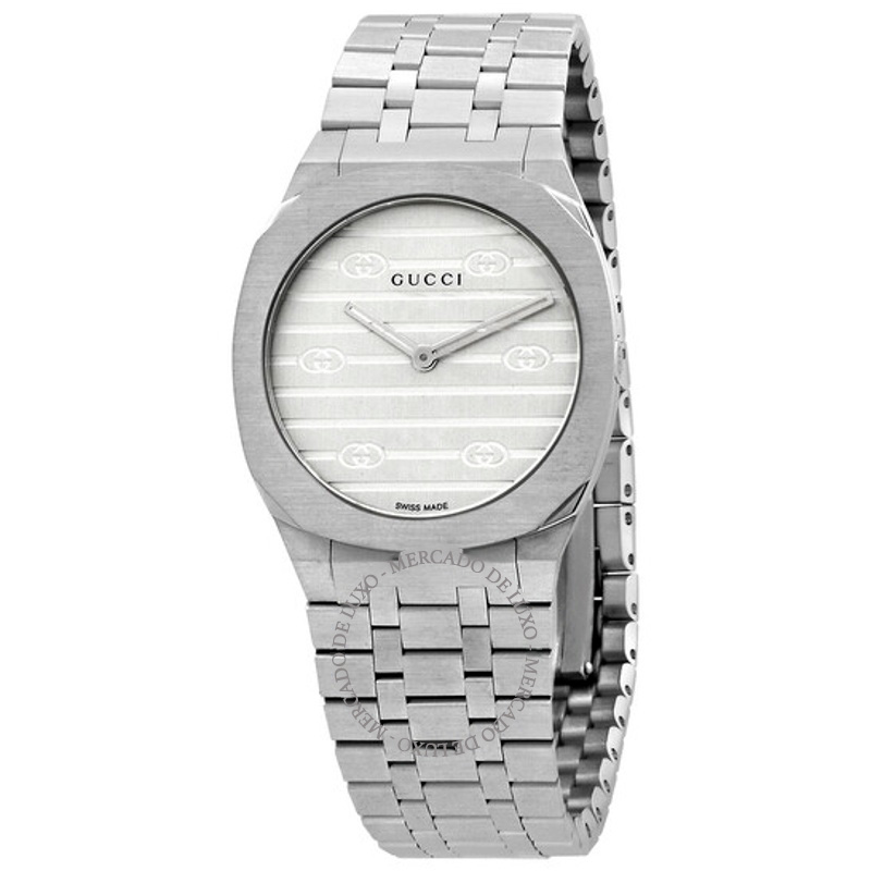 O Gucci Mostrador prateado de quartzo 25H 30 mm dialoga com ícones da maison e assume um caráter absolutamente atual. Com mostrador prateado, 30 mm, o conjunto ganha textura e profundidade.