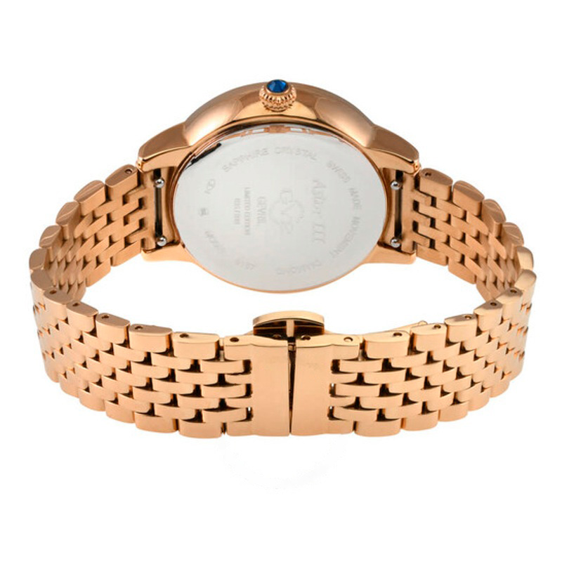 O Gv2 By Gevril Astor III Mostrador em Madrepérola 34 mm apresenta proporções serenas e presença que não precisa de holofotes. A caixa em aço inoxidável, rosa, mostrador madrepérola, 34 mm reforça o caráter escultural.