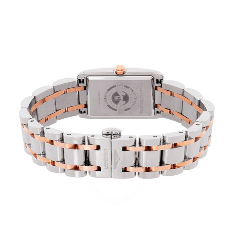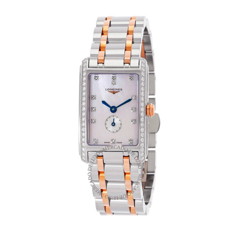 O Longines DolceVita Quartz Diamond Mostrador Branco Madrepérola 32 mm combina arquitetura limpa com riqueza de detalhes que revelam-se a cada olhar. caixa em aço inoxidável, rosa, luneta cravejada,...