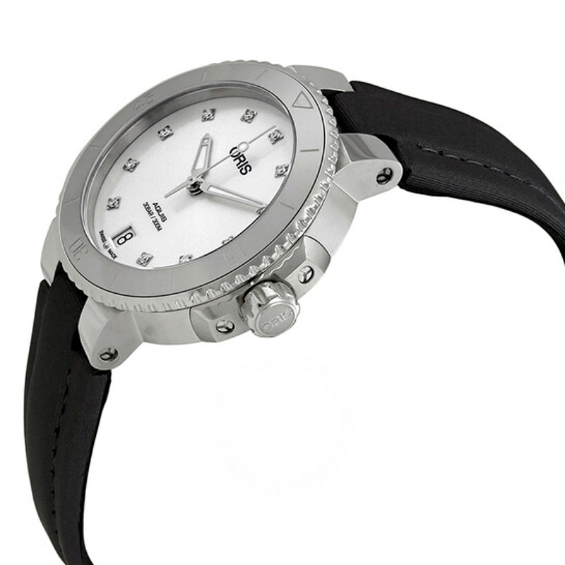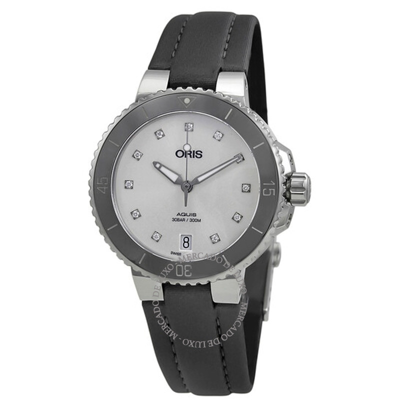 O Oris Aquis Date Diamond Dial Automático 01 733 7731 4191-07 5 36 mm interpreta os códigos da casa com linhas puras e volume preciso. caixa em aço inoxidável, luneta cravejada de, mostrador prateado...