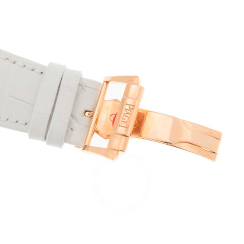 O design destaca caixa de 43 mm, em ouro rosa 18k, mostrador branco, pulseira em couro de aligátor, joalheria com diamantes, safiras, com superfícies alternando polimentos e escovamentos finos para um jogo de luz sutil e sofisticado.
