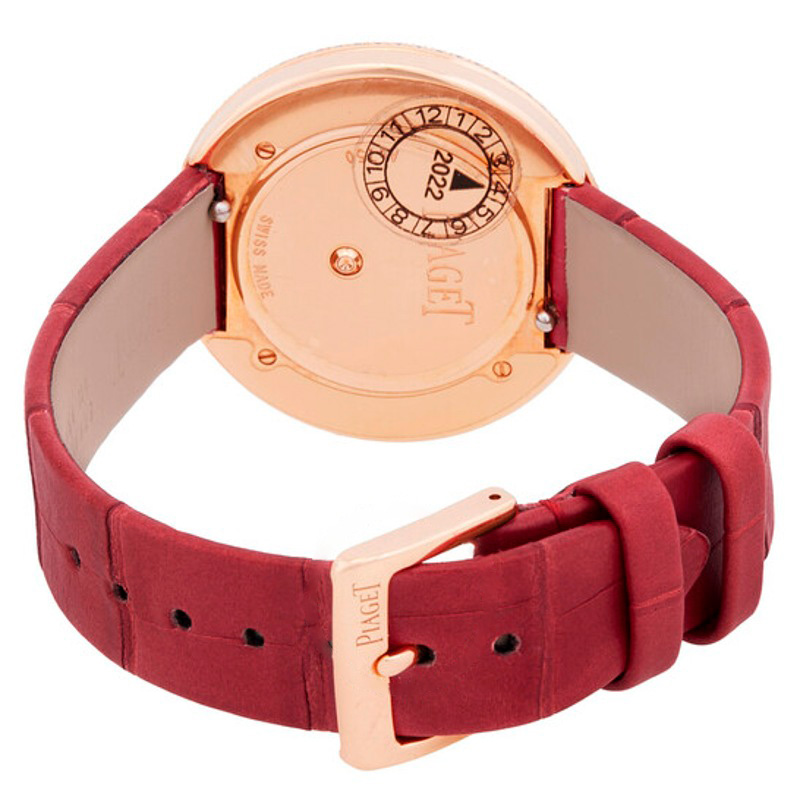 O design destaca caixa de 34 mm, em ouro rosa 18k, mostrador branco, pulseira em couro, joalheria com diamantes, safiras, com superfícies alternando polimentos e escovamentos finos para um jogo de luz sutil e sofisticado.