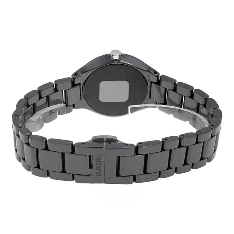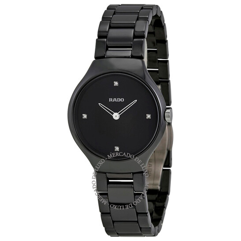 O Rado True Thinline Mostrador Preto Cerâmica Preta 30 mm trabalha reflexos e texturas em um desenho que respeita a ergonomia. caixa em cerâmica, mostrador preto, 30 mm. Acabamentos de alto padrão evidenciam o trabalho de bancada.