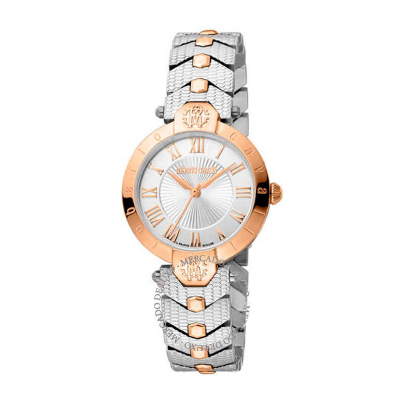 O Roberto Cavalli de moda quartzo mostrador prateado 30 mm interpreta os códigos da casa com serenidade, deixando a luz trabalhar as superfícies. caixa em aço inoxidável, rosa, mostrador prateado, 30...