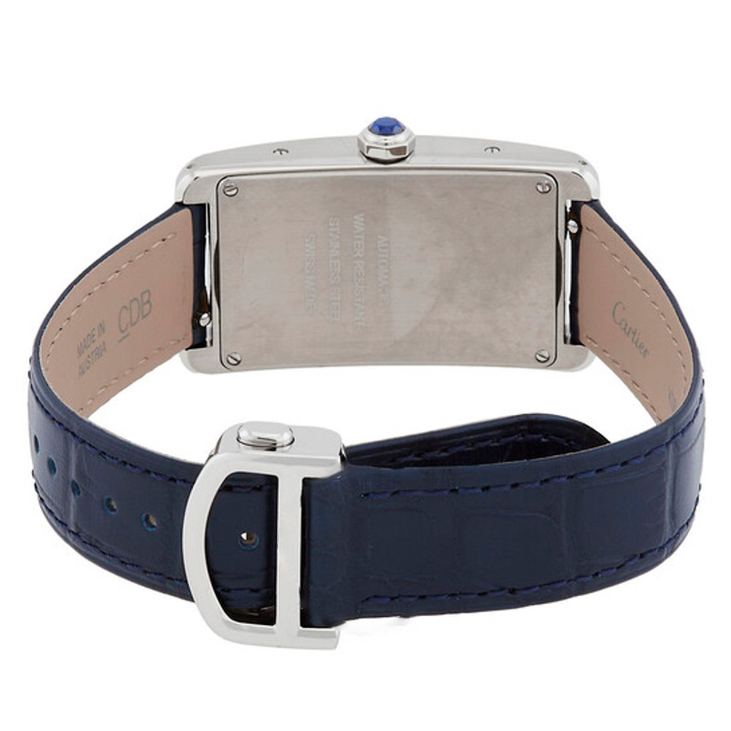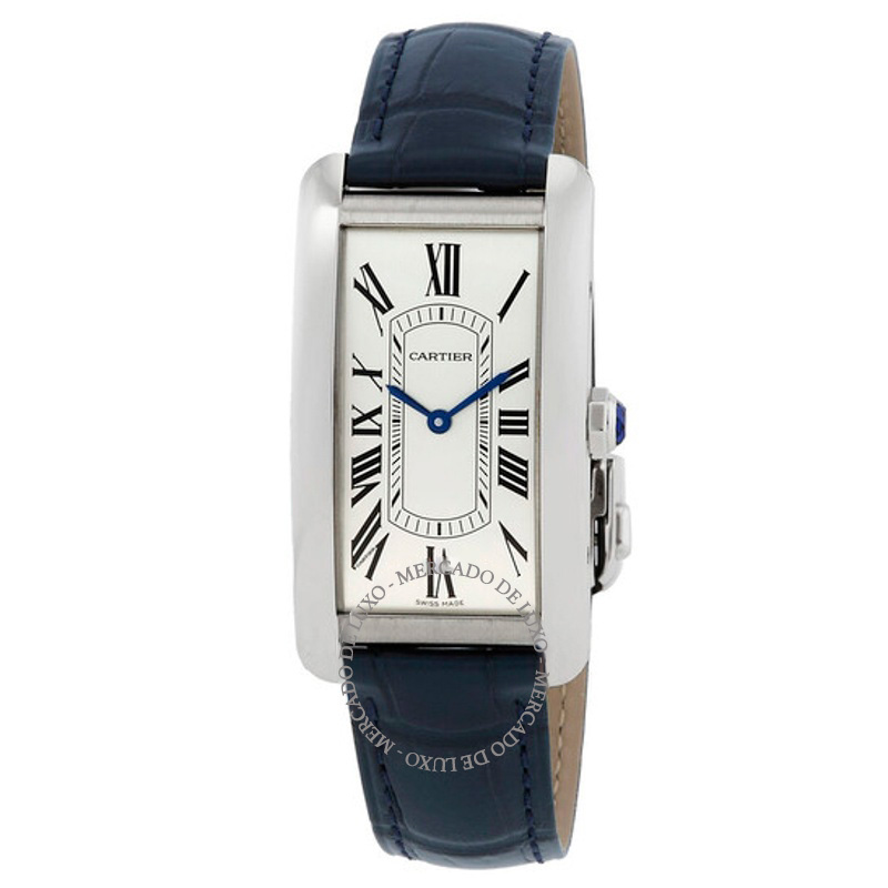 A Cartier apresenta o Tank Américaine, um relógio automático grande de 44.4 mm x 24.4 mm em aço inoxidável com pulseira de couro preto de crocodilo, um design retangular alongado que evoca a elegância da Art Deco americana desde 1989. Esta peça é uma obra-prima clássica, perfeita para o homem que valoriza sofisticação, como destacado em coleções exclusivas.