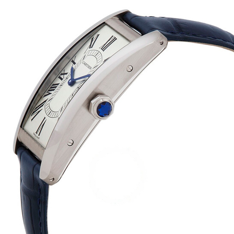 A Cartier apresenta o Tank Américaine, um relógio automático grande de 44.4 mm x 24.4 mm em aço inoxidável com pulseira de couro preto de crocodilo, um design retangular alongado que evoca a...