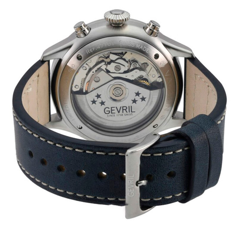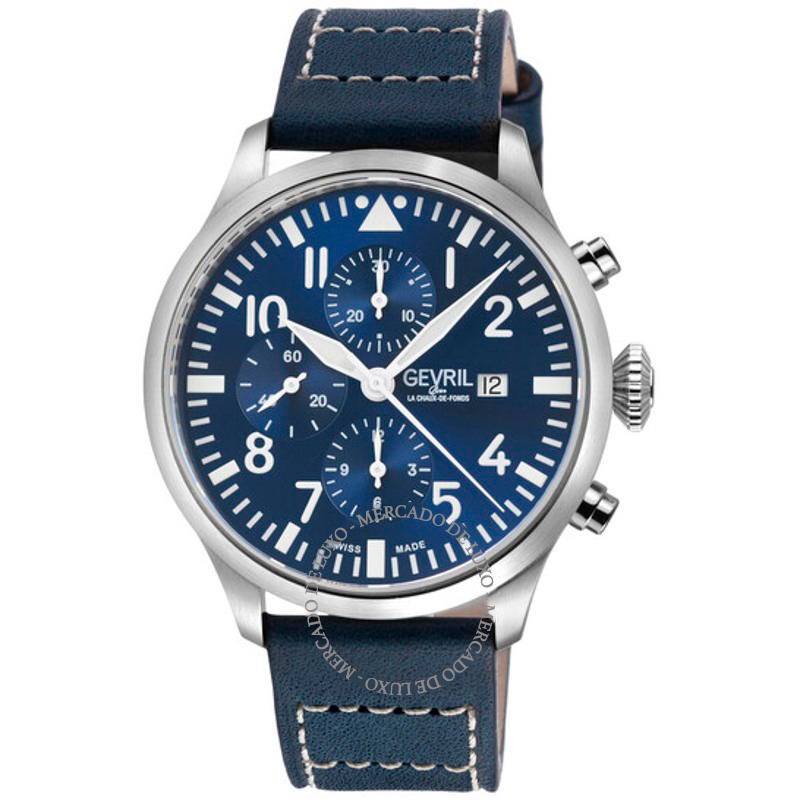 O Gevril Cronógrafo Vaughn Automático ETA 7750 Mostrador Azul Interpreta os códigos da casa com serenidade e atenção à luz. Mostrador azul.