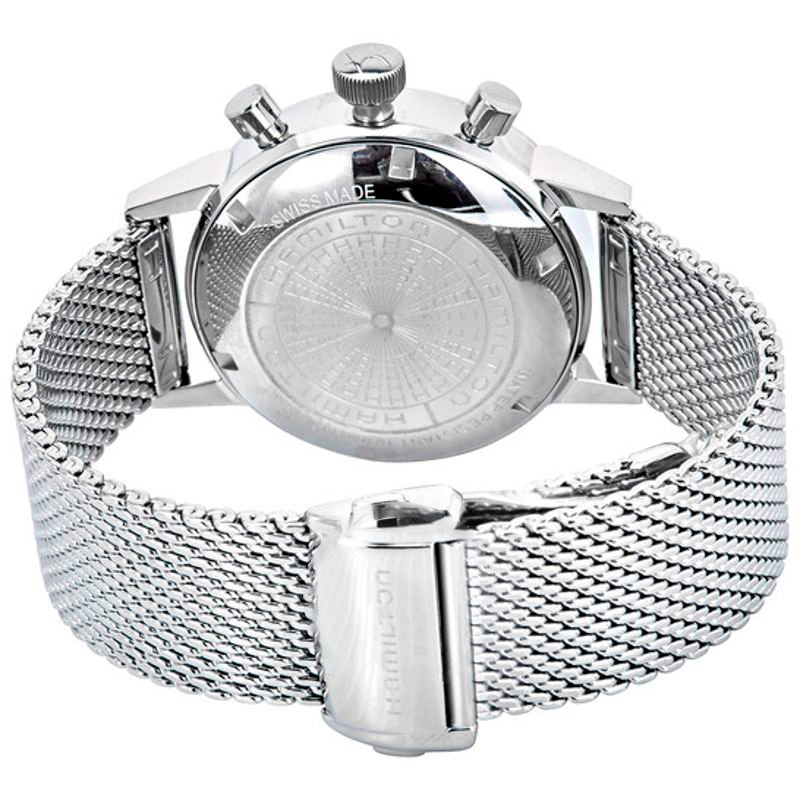No coração, a mecânica suíça é regulada para estabilidade cronométrica e longa vida. Movimento automático, calibre H-31, frequência 28800 vph, complicações: data, cronógrafo, vidro safira, WR 100 m, pulseira bracelete metálico.