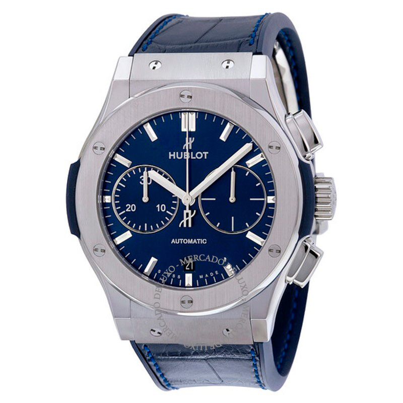 O mostrador azul sunray acetinado, com marcadores de hora em índices e ponteiros rodiados polidos, é uma vitrine de clareza e dinamismo, com dois submostradores de cronógrafo exibindo 60 segundos e 30 minutos, além de uma data na posição de 6 horas. O movimento automático Hublot Calibre HUB1143, baseado no ETA 2892-A2, com 59 joias e reserva de marcha de 42 horas, garante desempenho confiável. Cada detalhe, desde o cristal de safira resistente a arranhões até o fundo transparente, reflete a maestria da Hublot em combinar inovação e estilo.