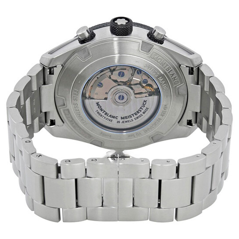 A arquitetura do mecanismo privilegia robustez estrutural e regularidade de marcha. Movimento automático, calibre MB, frequência 28800 vph, complicações: data, cronógrafo, vidro safira, WR 100 m, pulseira bracelete metálico.