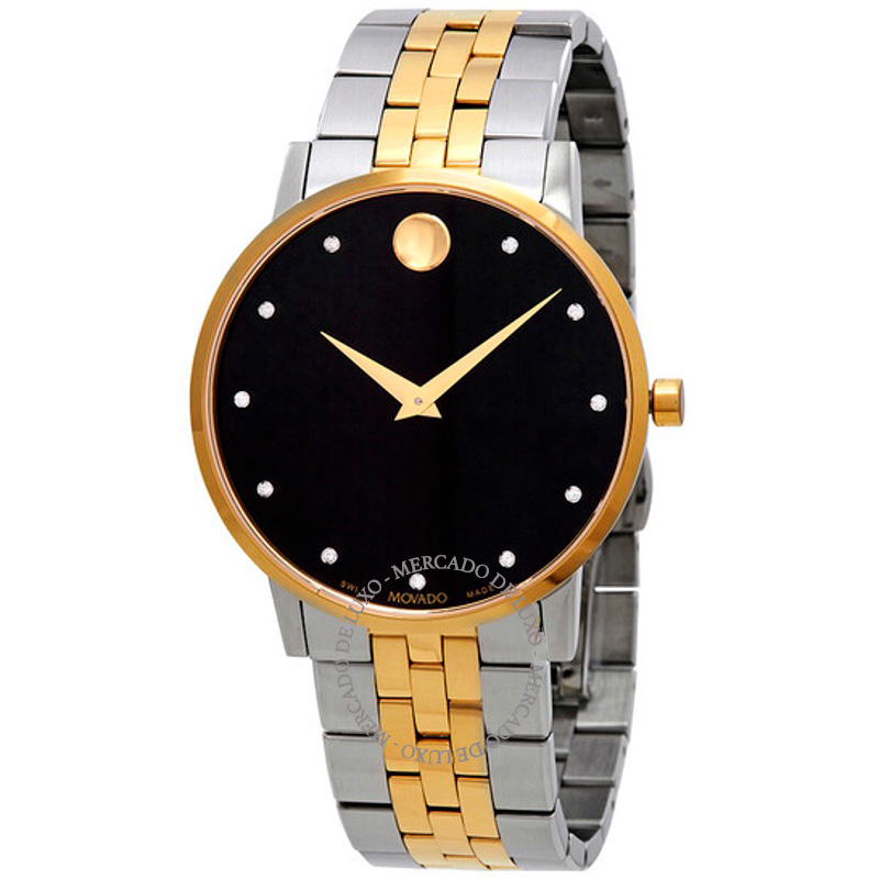 O Movado Mostrador de diamante preto clássico de museu 40 mm Traz uma leitura arquitetônica do tempo com superfícies bem trabalhadas. Caixa em aço inoxidável, amarelo, Luneta cravejada de, Mostrador...