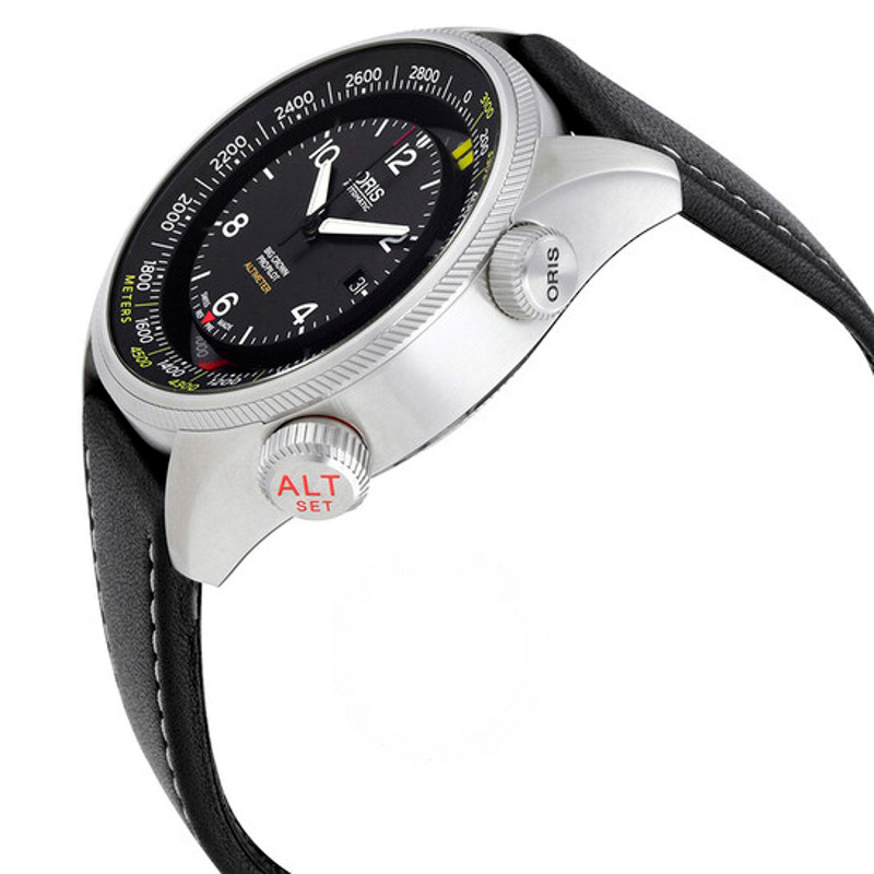 O Oris Altímetro Big Crown Automático Mostrador Preto 47 mm Traz uma leitura arquitetônica do tempo com superfícies bem trabalhadas. Caixa em aço inoxidável, Luneta canelada, Mostrador preto, 47 mm.