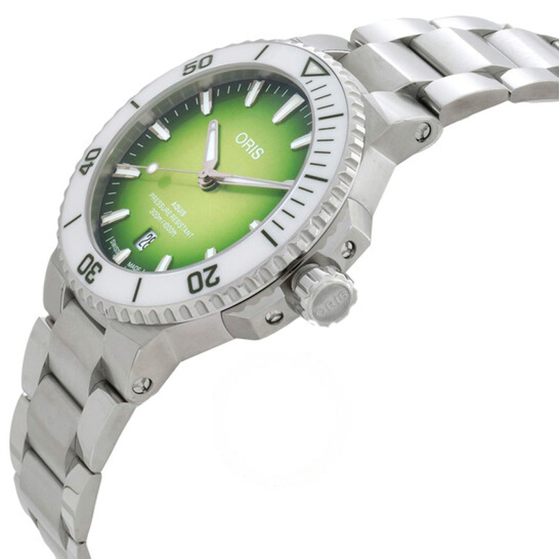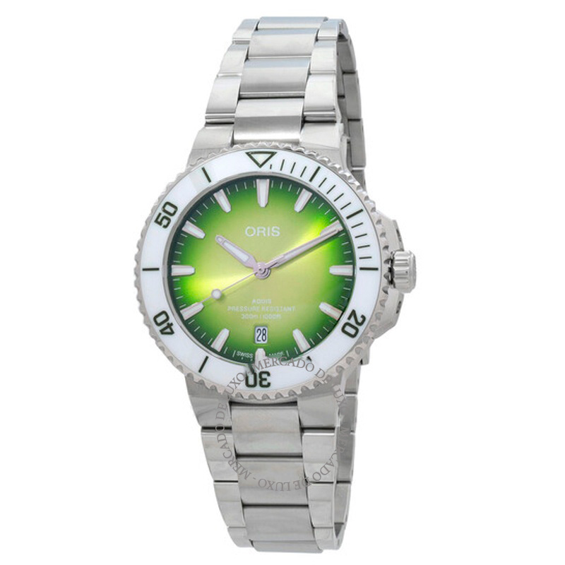 O Oris Aquis Date Automático Mostrador Verde 41 mm Traz uma leitura arquitetônica do tempo com superfícies bem trabalhadas. Caixa em aço inoxidável, cerâmica, Luneta cerâmica, Mostrador prateado, 41 mm.