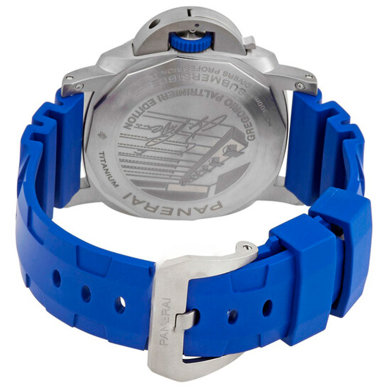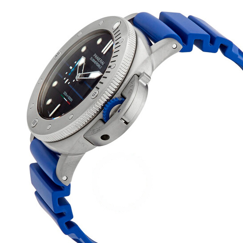 O Panerai Submersível Paltrinieri Automático Mostrador Preto 47 mm Traz uma leitura arquitetônica do tempo com superfícies bem trabalhadas. Caixa em titânio, Mostrador azul, 47 mm.