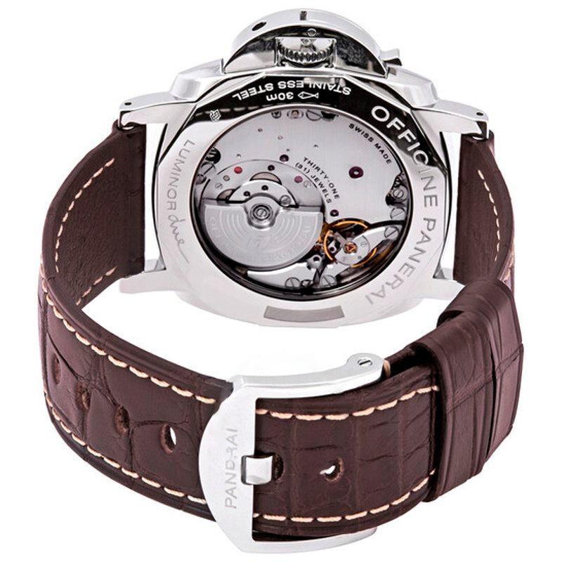 O Panerai Luminor Due GMT Mostrador Automático Antracite 45 mm Traz uma leitura arquitetônica do tempo com superfícies bem trabalhadas. Caixa em aço inoxidável, Mostrador prateado, 45 mm.