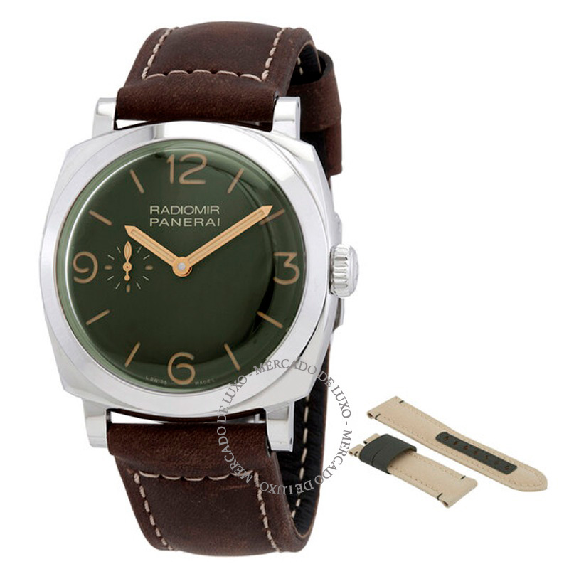 O Panerai Radiomir 1940 Mostrador Verde Automático 45 mm Interpreta os códigos da casa com serenidade e atenção à luz. Caixa em aço inoxidável, Mostrador prateado, 45 mm.