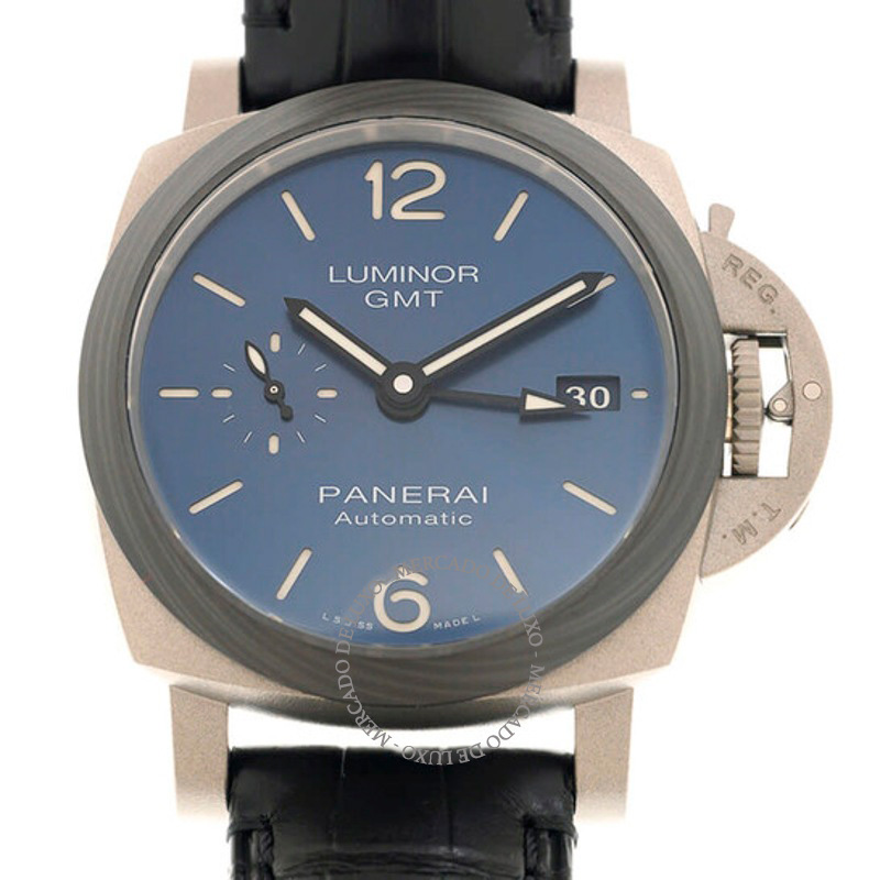 O Panerai Luminor GMT Automático Mostrador Azul 42 mm Equilibra herança e desenho atual em proporções bem resolvidas. Caixa em titânio, Mostrador azul, 42 mm.