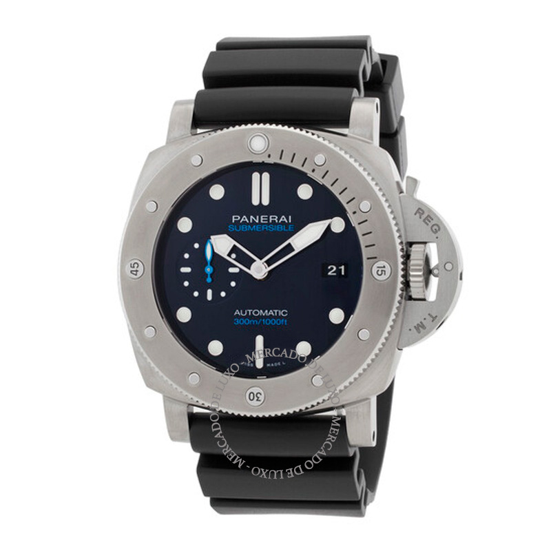 O Panerai Submersível BMG-TECH Mostrador Azul 47 mm Equilibra herança e desenho atual em proporções bem resolvidas. Mostrador azul, 47 mm.